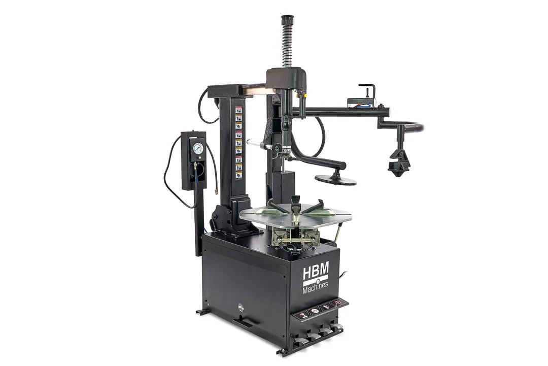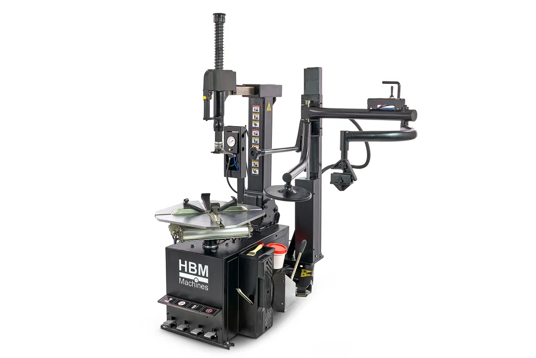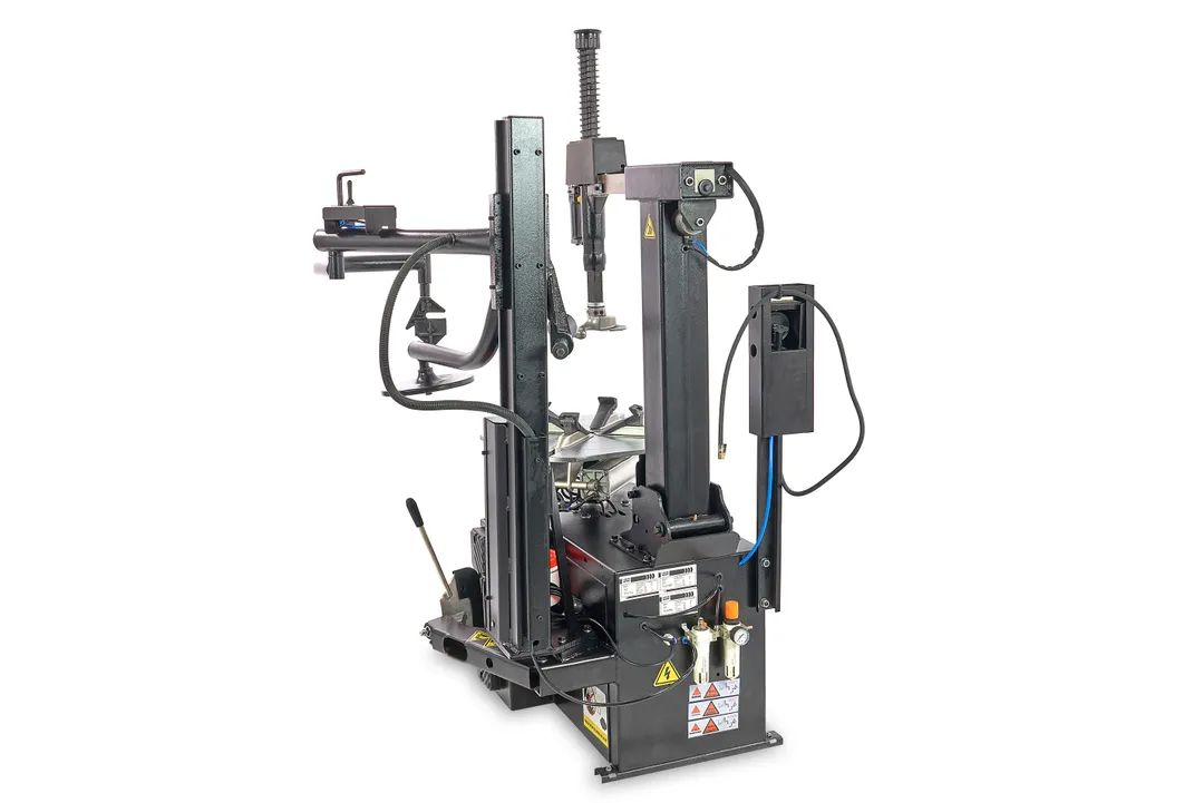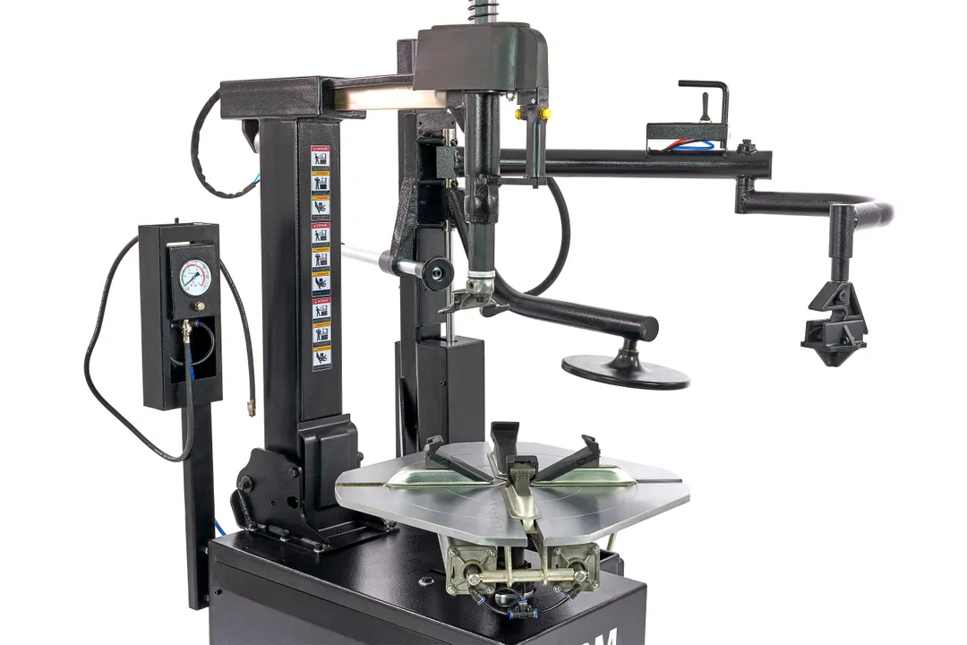 Appareil industriel pour montage et démontage de pneus avec bras d’assistance intégré, compatible avec des jantes de 10″ à 24″ et conçu pour les ateliers automobiles exigeants.