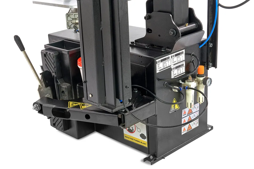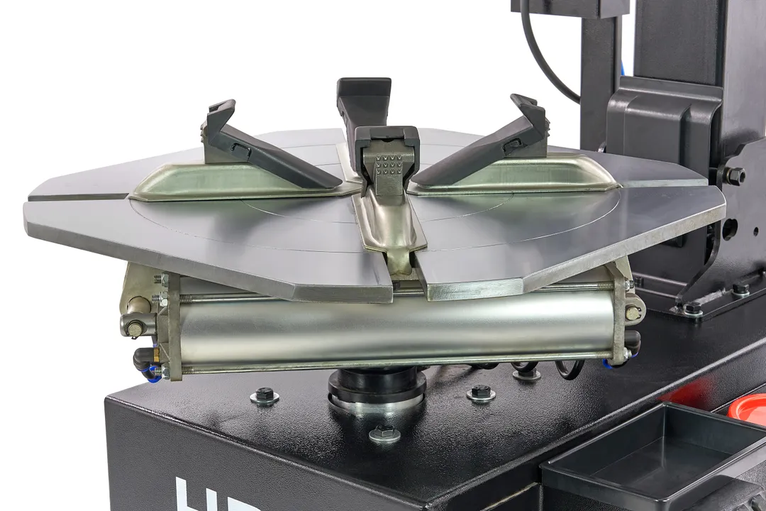 L’appareil est équipé d’un bras auxiliaire robuste qui facilite le démontage des pneus à profil bas ou rigides, réduisant l’effort nécessaire et améliorant la sécurité des opérations. Le contrôle de la vitesse d’ouverture et de fermeture des griffes se fait via une pédale de commande au pied, offrant un ajustement précis et une manipulation fluide.